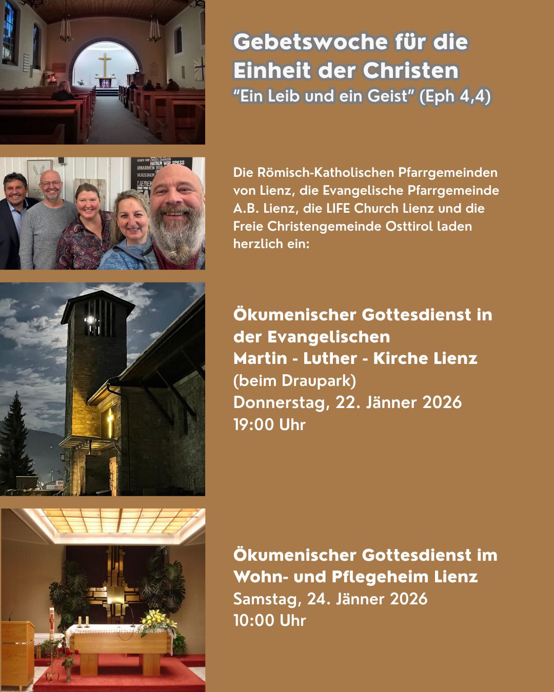 Die Römisch-Katholischen Pfarrgemeinden von Lienz, die Evangelische Pfarrgemeinde A.B. Lienz; die LIFE Church Lienz und die Freie Christengemeinde Osttirol laden herzlich ein: