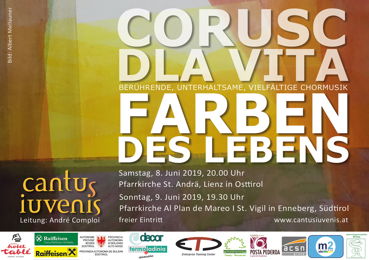 Pfarrkirche St. Andrä Pfarrgasse 4, Lienz20.00 Uhr: „Farben des Lebens“: Chorkonzert mit dem cantus iuvenis! Der in Wien beheimatete Chor cantus iuvenis bringt am Pfingstsamstag um 20.00 Uhr die Pfarre Lienz - St. Andrä mit einem bunten musikalischen Programm zum Strahlen. Etwa 40 Sängerinnen und Sänger, teils aus Süd- und Osttirol, besingen unter der Leitung von André Comploi die „Farben […]